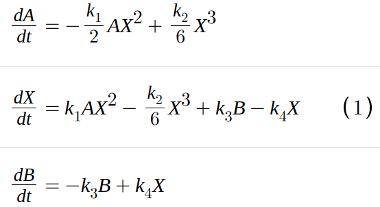 The model converts species A to B and viceversa via intermediate species X with rate constant given by Table 1. For the deterministic model and the reactions in Table 1 a solution converges to one of the two stable states, and stays in the neighborhood of that solution after a finite time. We can write a deterministic model equation for the rate change of X based on the laws of mass action. The system behaviors can be investigated by exploiting the deterministic approach (Kurtz 1970) which approximates its dynamics through a system of ordinary differential equations (ODEs):